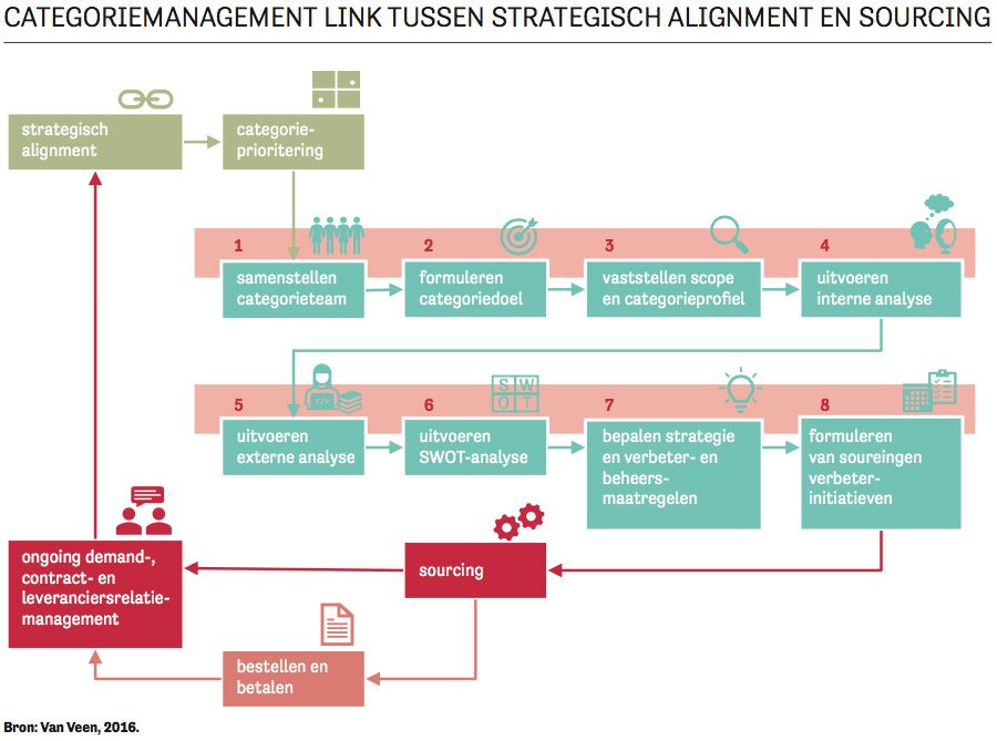 Categoriemanagement vormt zeg maar de link tussen organisatie en businessdoelen enerzijds, en de tactische uitvoering (sourcing) van inkoopprojecten anderzijds. Zo wordt de markt in staat gesteld impact te hebben op de doelen en waardedrijvers van de inkopende organisatie. Het hele proces is gericht op het realiseren van waardecreatie en impact en, waar relevant, het inkopen van oplossingen.