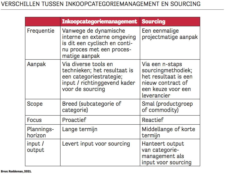 Met de categoriestrategie is de richting en het kader voor de hieropvolgende sourcing vastgesteld. Categoriemanagement is daarmee in de meeste sectoren van een ‘hogere orde’ dan sourcing. Dat zie je ook terug in de vergelijking van deze beide processen in onderstaande tabel, die voor de meeste sectoren geldt.