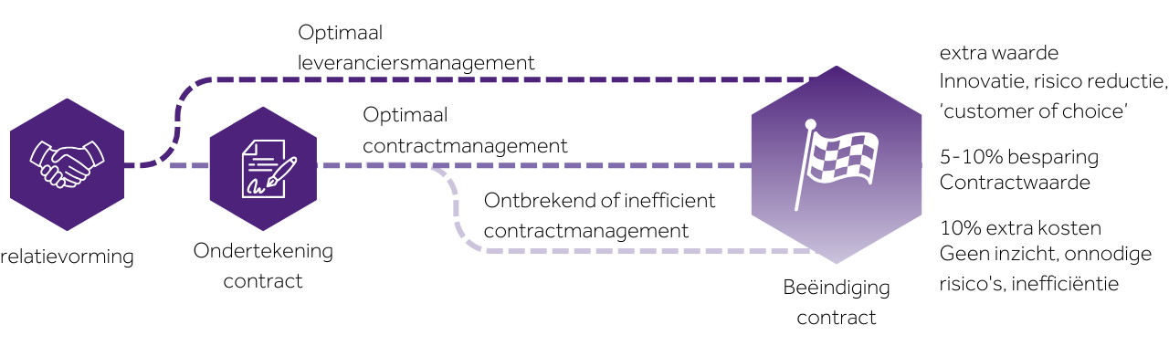Wat het u oplevert? Een optimalisatie van het behalen van waarde uit relaties en overeenkomsten. Ook voorkomt u dat er waarde weglekt uit uw contracten. Bovendien bouwt u aan sterke wederzijdse relaties met leveranciers, waardoor uw organisatie toegang krijgt tot kennis en innovaties in de markt .