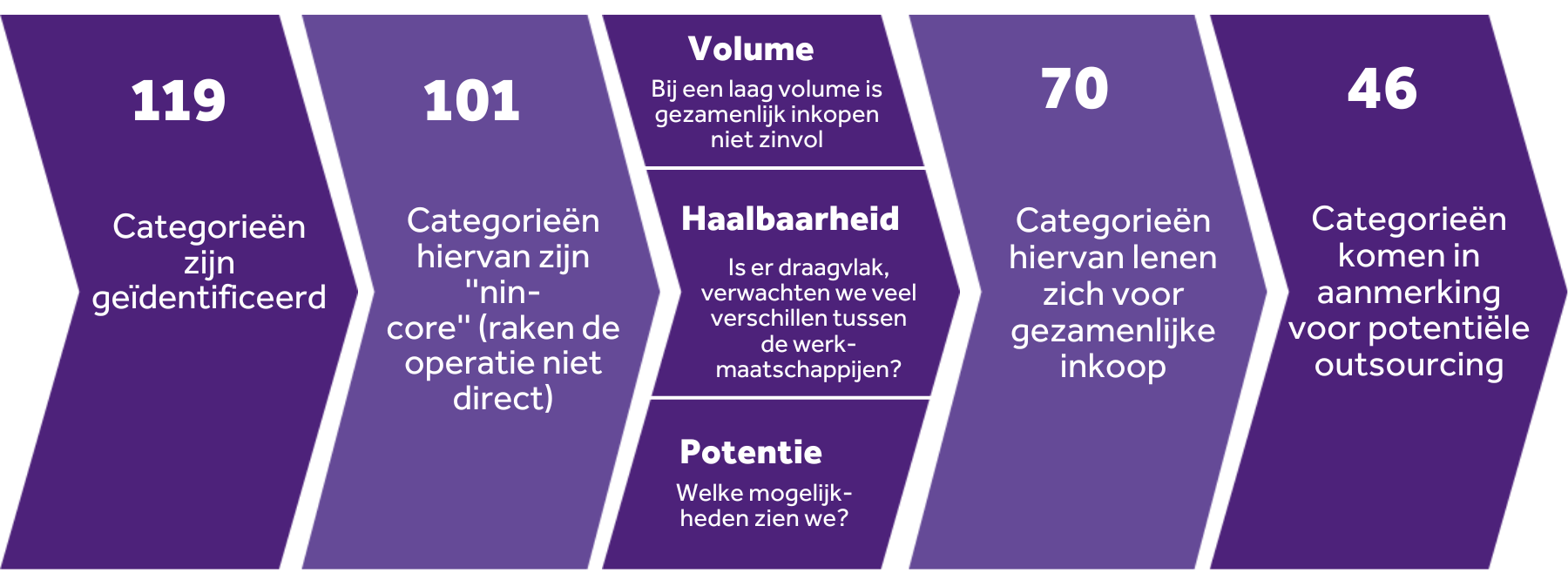 Inzicht in de uitgaven is het vetrekpunt van dit project. De spendanalyse, gemaakt met de AevesBenefit PowerBI spendtool, geeft een gedetailleerd overzicht van o.a. de inkoopuitgaven per leverancier, categorie en per organisatie. Dit is nodig om kansrijke categorieën voor gezamenlijke inkoop in kaart te brengen. Daarnaast biedt het inzichten om synergiepotentieel tussen verschillende leveranciers in dezelfde (sub)categorie vast te stellen. De vastgestelde categorieën vanuit de spendanalyse zijn diepgaand geanalyseerd door middel van benchmarking. Ook zijn er 16 contracten geanalyseerd op contract compliancy waarbij er 7 concrete besparingsinitiatieven zijn vastgesteld. Deze initiatieven zijn vervolgens geplot naar grootte van de besparing versus de vereiste inspanning om besparingen te realiseren.